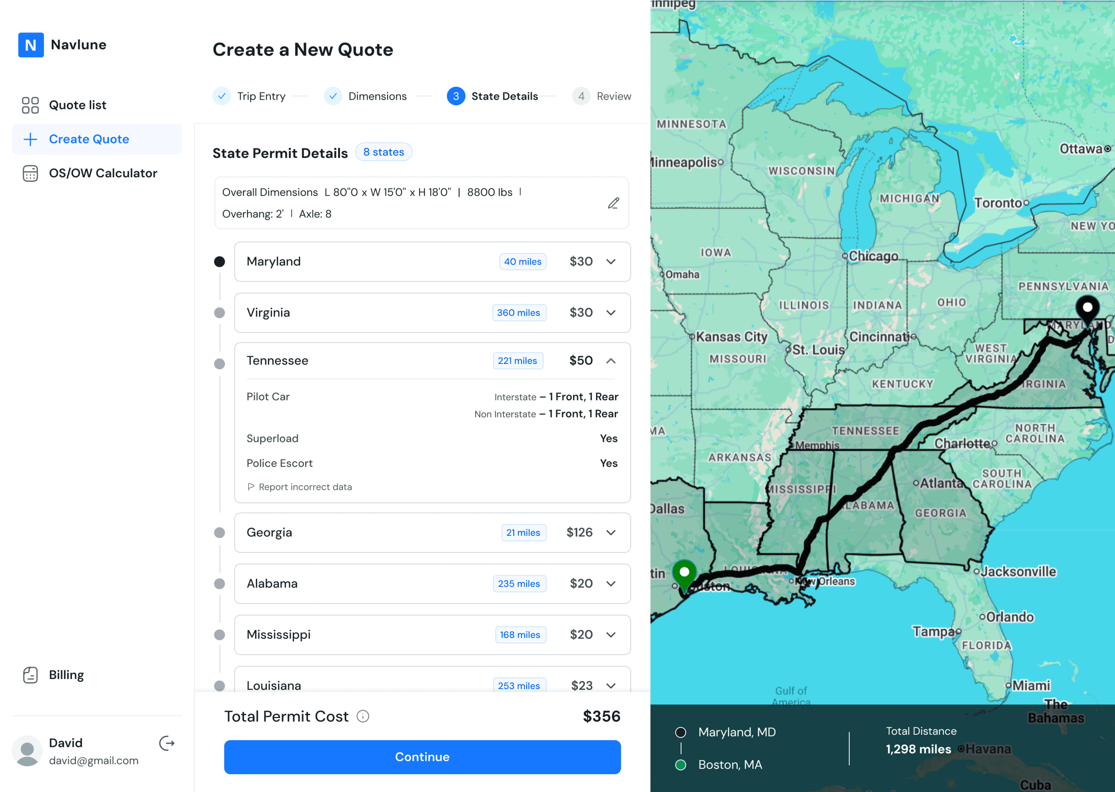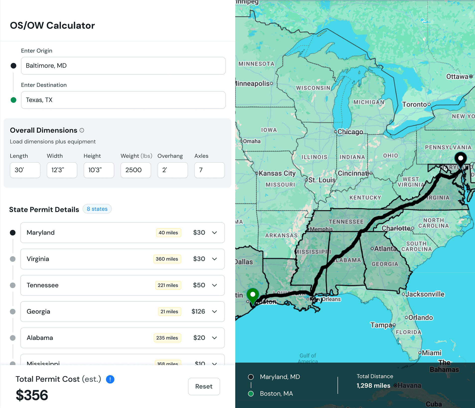 State-specific rules for dimensions, weight, and overhang are applied automatically by route.